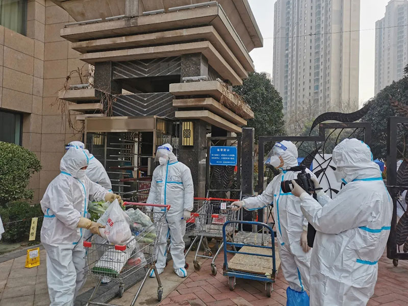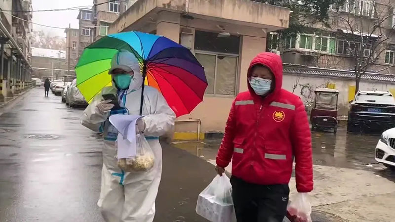 2021年12月25日,西安日報(bào)社記者李東峰(右)在采訪之余,為西安市蓮湖區(qū)勞動(dòng)一坊社區(qū)居家隔離戶送菜。