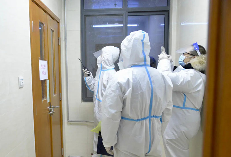 2021年12月25日,華商報(bào)記者寧峰(右)在西安市胸科醫(yī)院污染區(qū)采訪。