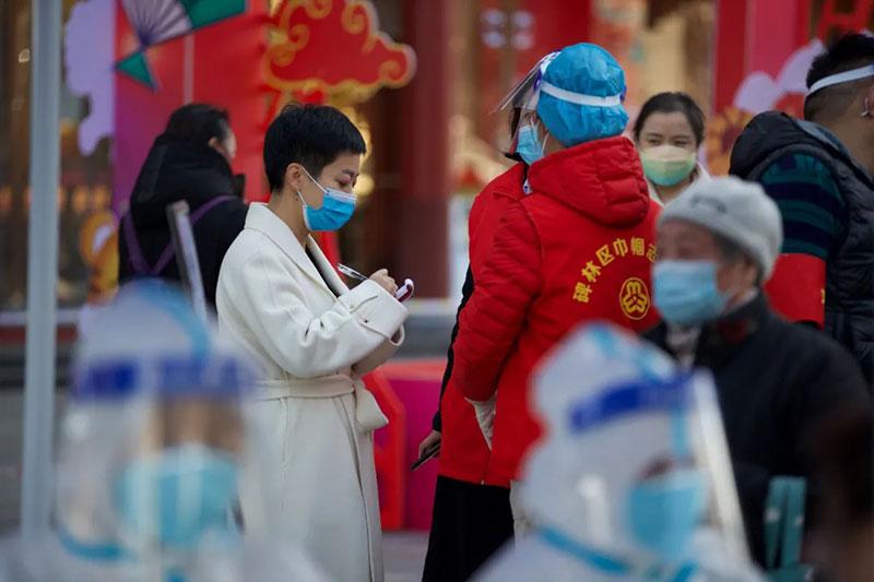 2021年12月23日,咸陽日報(bào)社記者李石(左)在全員核酸檢測點(diǎn)采訪。