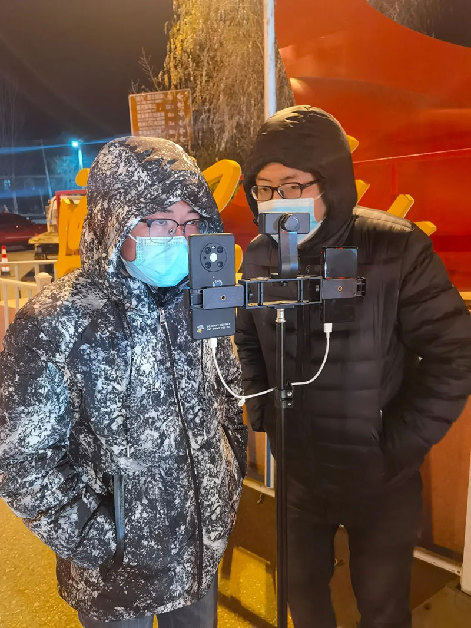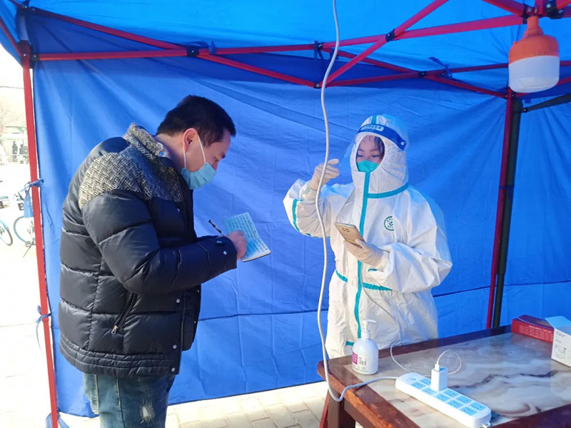 2021年12月21日,陜西日報(bào)社記者齊卉(左)在采訪參與一線防疫的志愿者。