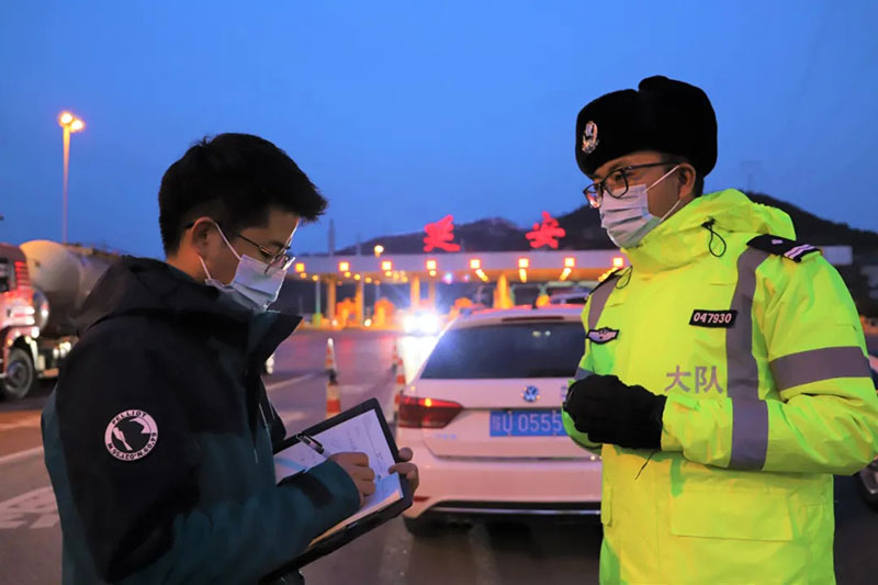 2021年12月24日,陜西日報(bào)社延安站記者陳宏江(左)在延安北高速公路口疫情防控檢查站采訪執(zhí)勤交警。