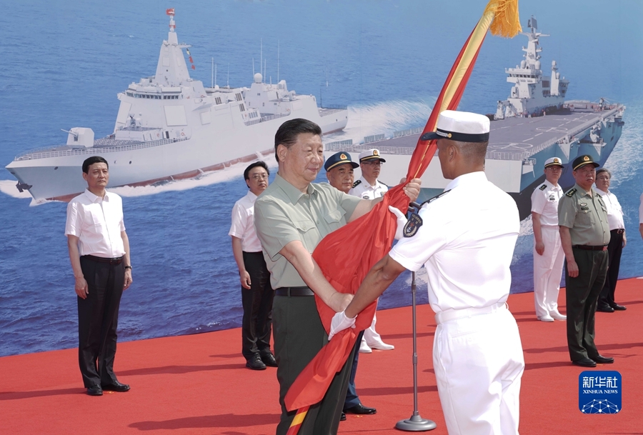 2021年4月23日,海軍三型主戰(zhàn)艦艇——長征18號艇、大連艦、海南艦在海南三亞某軍港集中交接入列。中共中央總書記、國家主席、中央軍委主席習近平出席交接入列活動并登上艦艇視察。這是習近平向長征18號艇授予軍旗、命名證書。