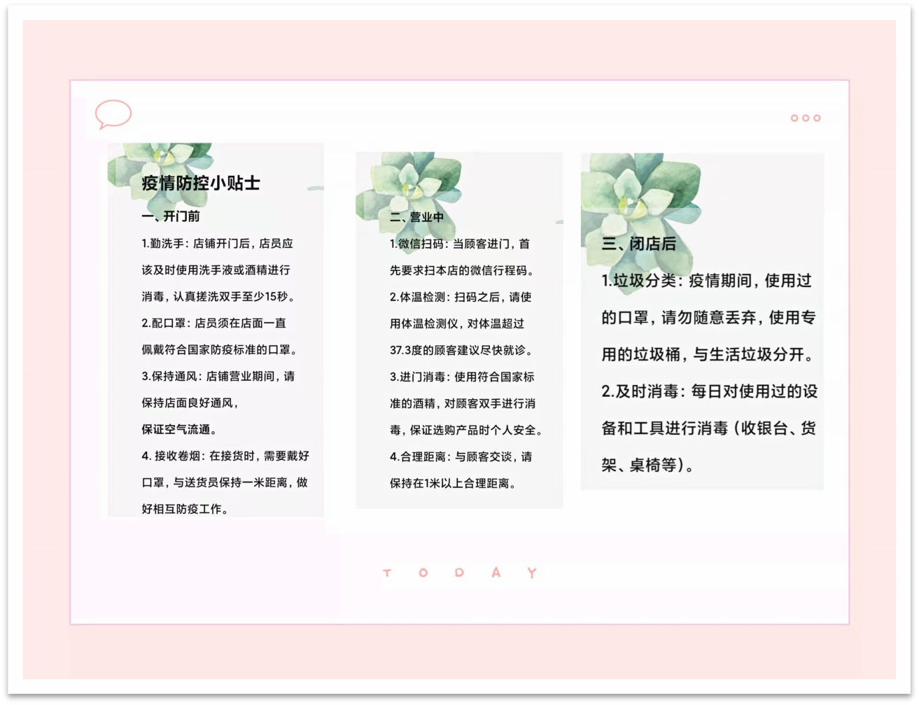 而近期面對日益嚴(yán)峻的疫情防控形勢,正常營業(yè)的店鋪如何進(jìn)行防疫工作成了重中之重,對此,客戶經(jīng)理高飛制作了提醒服務(wù)小貼士對卷煙零售客戶進(jìn)行防疫宣傳工作。