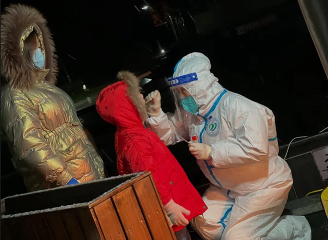 “姐姐,你冷不冷,你手疼不疼?”在排隊的隊伍中,一個小姑娘帶著哭腔問身著防護(hù)服的王航英。原來,王航英已經(jīng)連續(xù)采集核酸近十個小時,換班時她脫下手套,想抽一張紙,結(jié)果雙手被凍得通紅,反復(fù)幾次都沒成功。