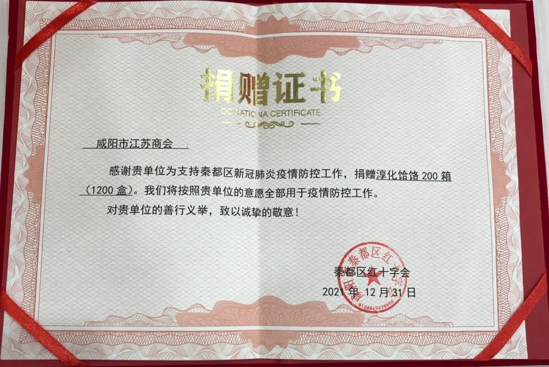 面對(duì)新一輪疫情,咸陽市江蘇商會(huì)及會(huì)員企業(yè)以不同的方式表達(dá)對(duì)咸陽市一線工作人員的關(guān)懷、對(duì)咸陽戰(zhàn)“疫”的支持,展現(xiàn)了一幕幕一心共同抗疫情的感人畫面,充分展現(xiàn)了咸陽市江蘇商會(huì)助力抗擊疫情的決心和信心,秦都區(qū)紅十字會(huì)向咸陽市江蘇商會(huì)頒發(fā)捐贈(zèng)證書。