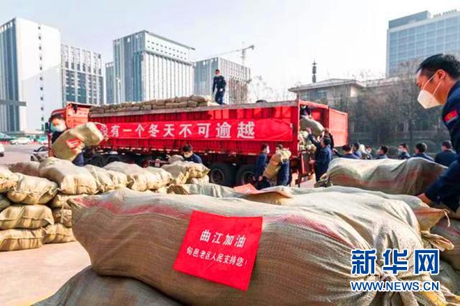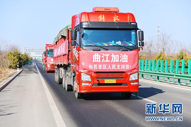 “沒有一個(gè)冬天不會(huì)過去,沒有一個(gè)春天不會(huì)到來。”2022年元旦過后,貼著車體標(biāo)語(yǔ)的運(yùn)輸車隊(duì),滿載著30萬(wàn)陜西旬邑紅色老區(qū)父老鄉(xiāng)親暖暖的情誼直奔西安曲江。