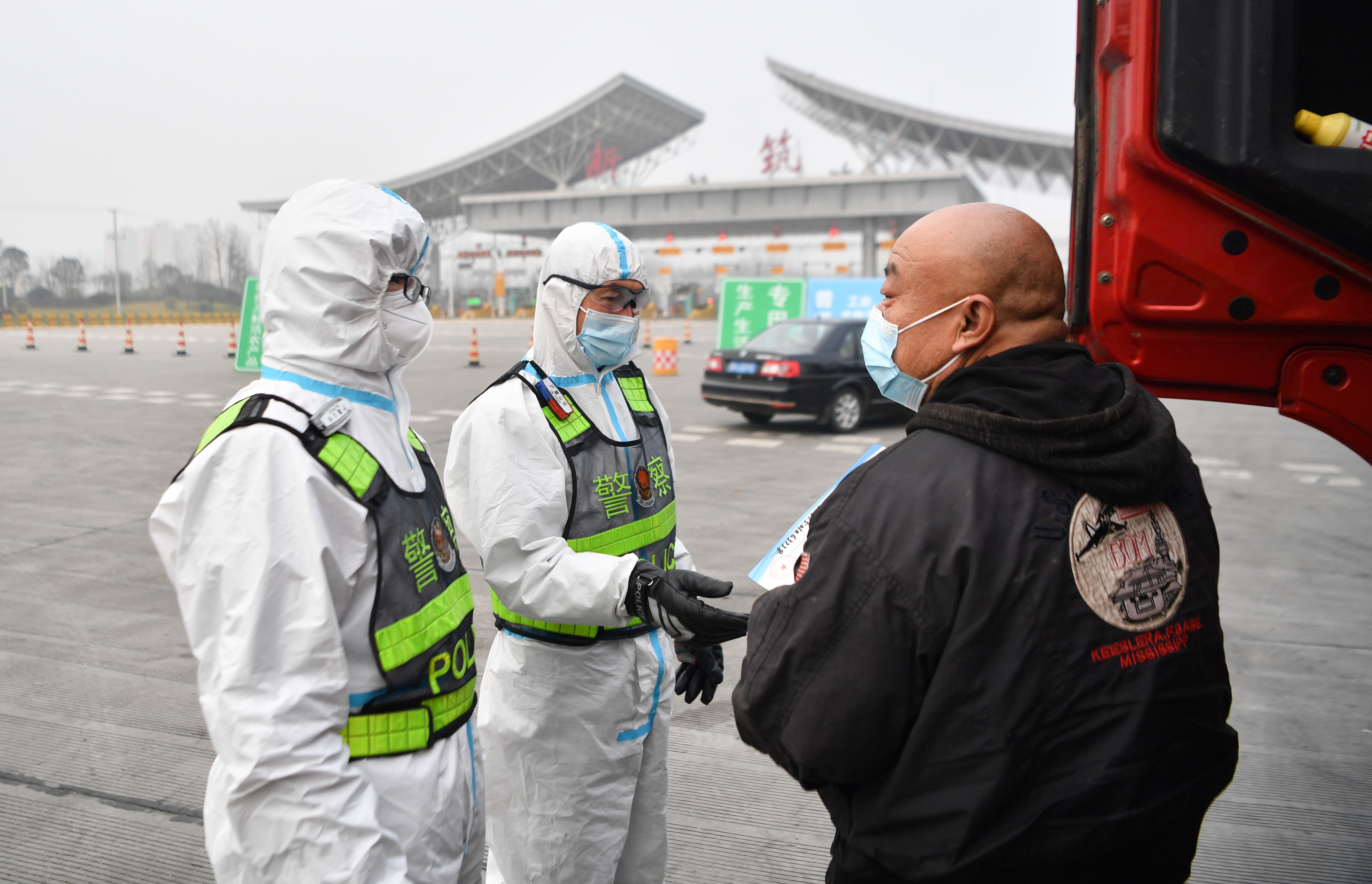 1月10日,西安市公安局交通警察支隊高新大隊民警在西安市繞城高速河池寨收費(fèi)站與駕駛員交流。