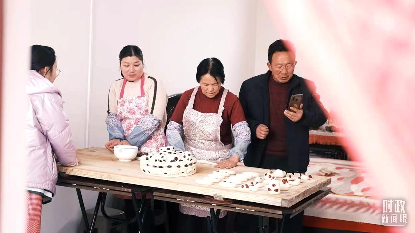 △師紅兵(右一)和妻子朱海丹(右二)正在制作年饃。(總臺(tái)央視記者盧心雨拍攝)