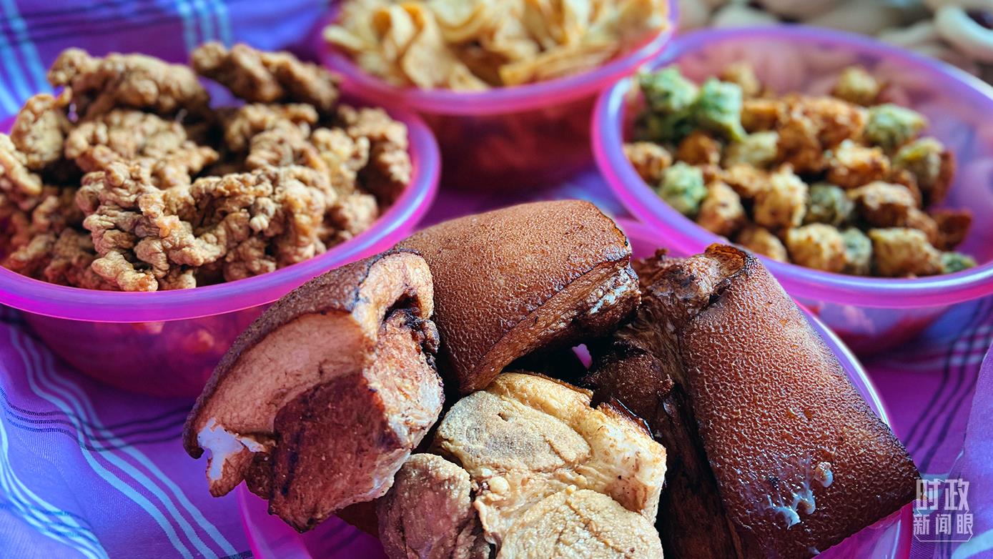 △蔡文明一家制作的燉排骨、年饃、紅燒肉、小酥肉等。(總臺(tái)央視記者鐘鋒、李輝、楊波拍攝)