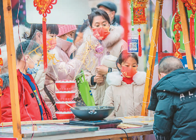 2021年,湖北省經(jīng)濟增速領(lǐng)跑全國,成績亮眼。圖為春節(jié)期間,游客在武漢武昌楚河漢街觀看糖畫。趙廣亮攝(人民視覺)