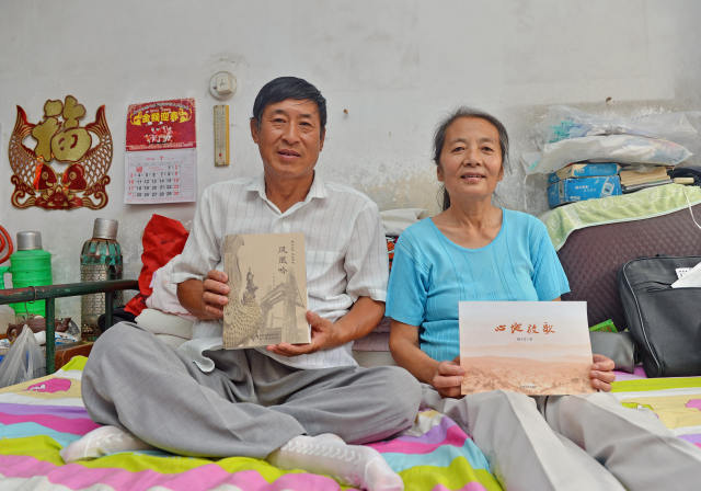 △楊玉芳(左)、高志宏(右)夫婦在家中展示他們所寫的書(shū)。