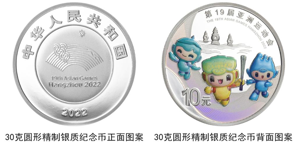 30克圓形銀質(zhì)紀念幣背面圖案為第19屆亞洲運動會吉祥物,輔以火炬、三潭印月、飄帶等元素裝飾組合設(shè)計,并刊“第19屆亞洲運動會”等字樣。該紀念幣含純銀30克,最大發(fā)行量2萬枚。