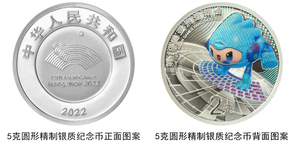 5克圓形銀質(zhì)紀念幣背面圖案為第19屆亞洲運動會吉祥物電子競技運動造型,輔以互聯(lián)網(wǎng)科技符號、跑道等元素裝飾組合設(shè)計,并刊“第19屆亞洲運動會”等字樣。該紀念幣含純銀5克,最大發(fā)行量10萬枚。