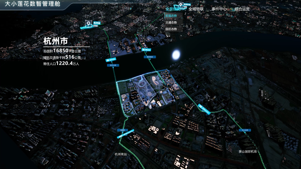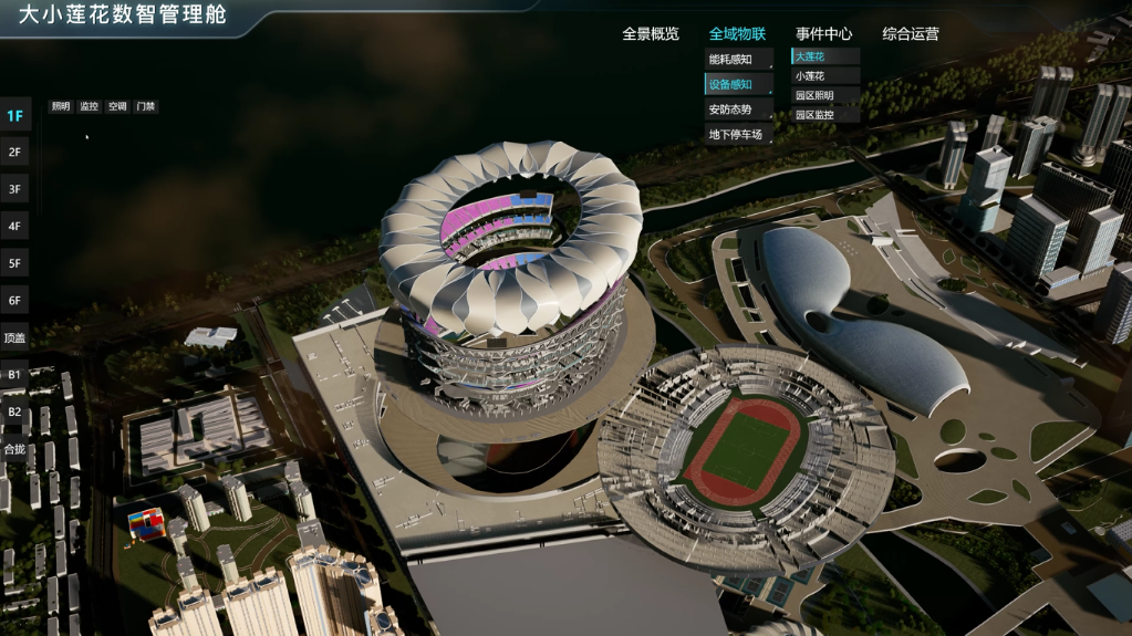 因外形酷似兩朵盛開的蓮花,杭州奧體中心主體育場和網(wǎng)球中心決賽館常被杭州市民昵稱為“大小蓮花”。走進(jìn)奧體中心運(yùn)營大廳,映入眼簾的是一塊超級(jí)大屏,名為“大小蓮花”數(shù)智管理艙,屏幕上呈現(xiàn)的是整個(gè)奧體園區(qū)的虛擬模型。