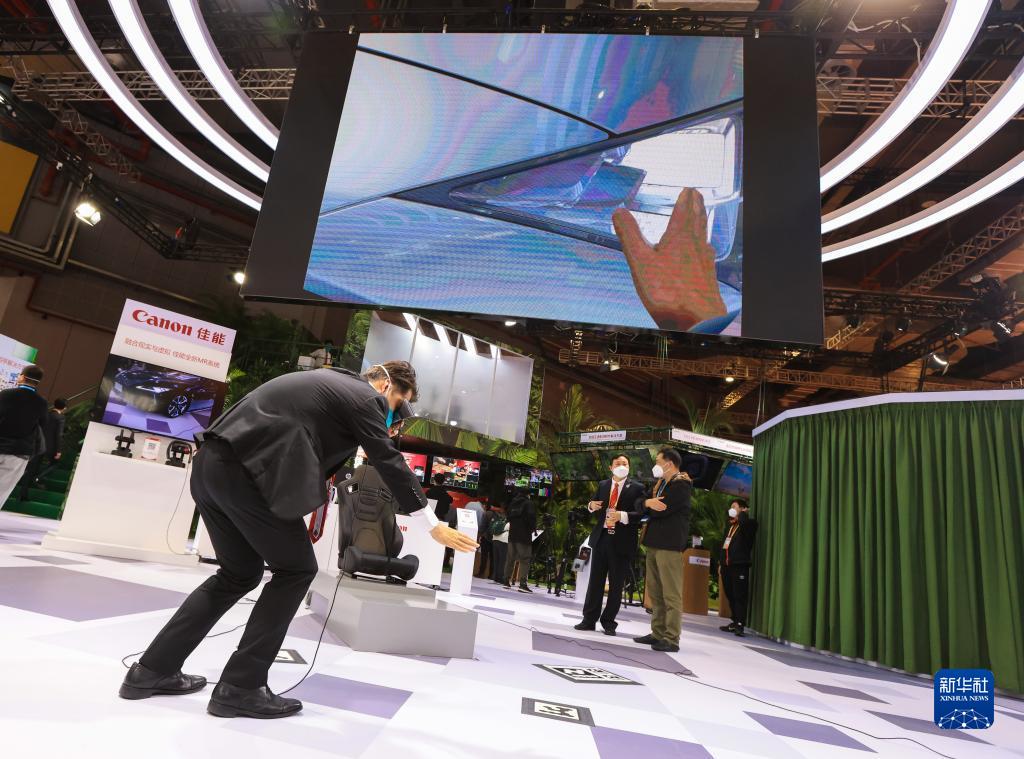 11月7日,展商在第五屆進博會佳能展臺演示MR虛擬現實系統(tǒng)。新華社記者 李京 攝