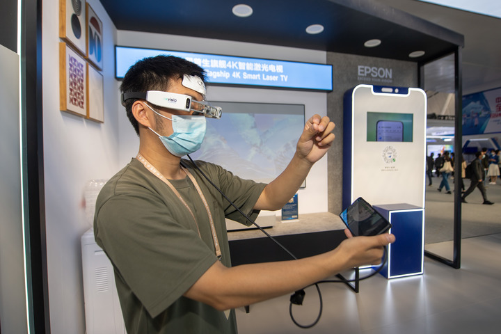 11月10日,觀眾在愛(ài)普生公司展臺(tái)體驗(yàn)AR感知交互眼鏡系統(tǒng)。新華社記者 江漢 攝