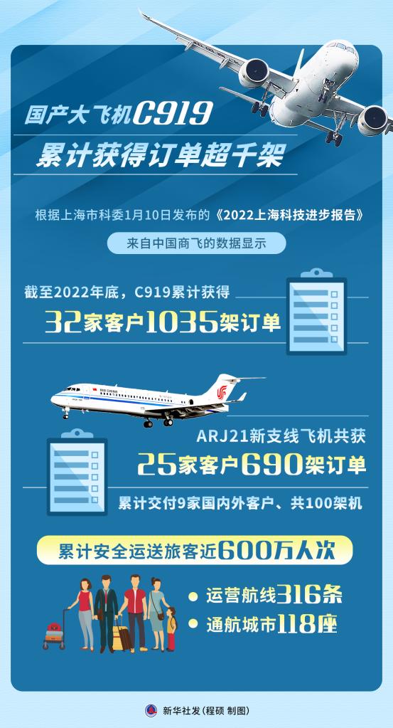 根據(jù)上海市科委1月10日發(fā)布的《2022上??萍歼M(jìn)步報(bào)告》,來(lái)自中國(guó)商飛的數(shù)據(jù)顯示,2022年12月,C919大型客機(jī)首架機(jī)交付首家用戶(hù)東方航空公司,邁出市場(chǎng)運(yùn)營(yíng)“第一步”。截至2022年底,C919累計(jì)獲得32家客戶(hù)1035架訂單。