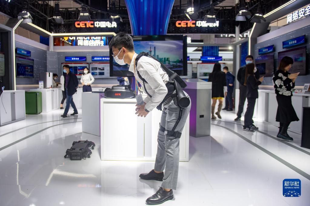 在浙江烏鎮(zhèn)舉辦的2022年“互聯網之光”博覽會上,中國電科工作人員為觀眾演示外骨骼機器人的使用(2022年11月8日攝)。新華社記者 江漢 攝