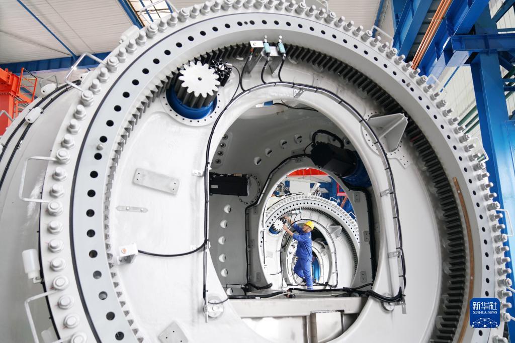 在黑龍江省齊齊哈爾市中國一重集團有限公司風電裝備生產制造廠生產車間,工人進行生產作業(yè)(2021年7月1日攝)。新華社記者 王建威 攝