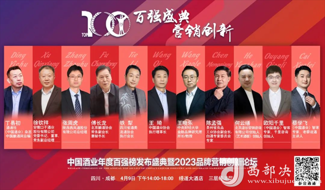 西部決策網(wǎng)訊(記者劉玉 韓宗憲)聚焦中國(guó)酒業(yè)百?gòu)?qiáng)群英,助力品牌營(yíng)銷(xiāo)創(chuàng)新管理。4月9日,中國(guó)酒業(yè)年度百?gòu)?qiáng)榜發(fā)布盛典暨2023品牌營(yíng)銷(xiāo)創(chuàng)新論壇在成都盛大開(kāi)啟。行業(yè)各協(xié)會(huì)領(lǐng)導(dǎo)、智庫(kù)專(zhuān)家、意見(jiàn)領(lǐng)袖及全國(guó)200家企業(yè)和經(jīng)銷(xiāo)商代表,共同見(jiàn)證行業(yè)百?gòu)?qiáng)與酒業(yè)營(yíng)銷(xiāo)人的風(fēng)采。