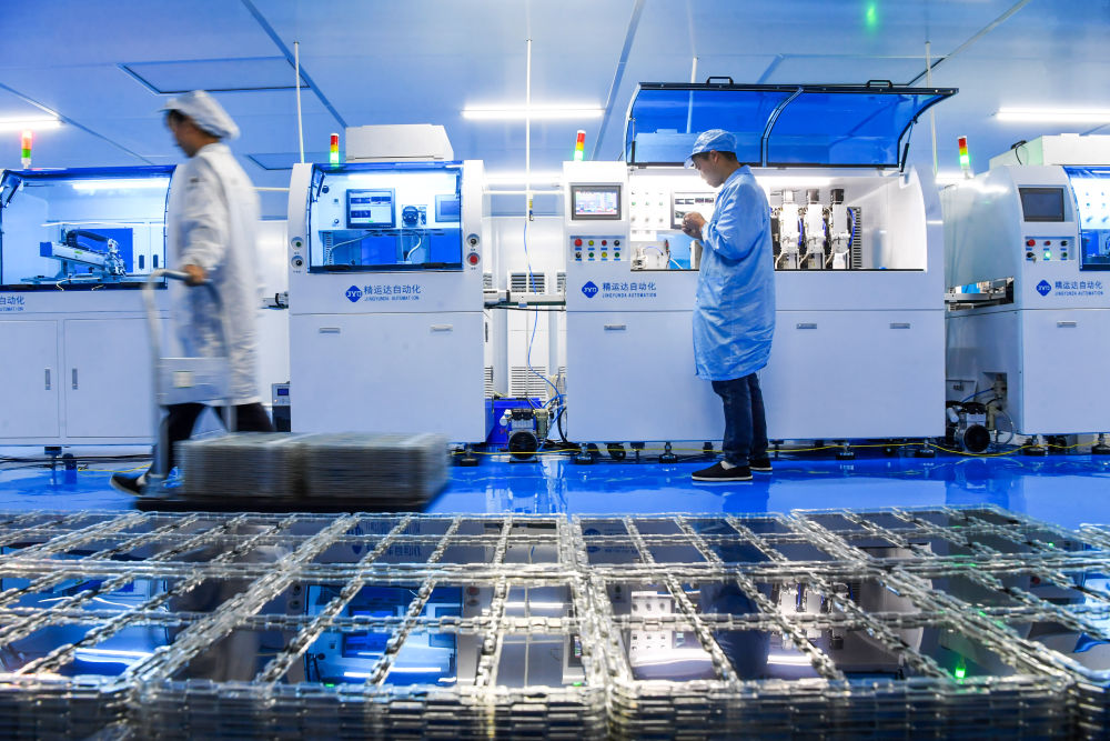 12月12日,宜春市上高縣江西挺好光電科技有限公司的工人在生產線上趕制液晶顯示屏。(周亮 攝)