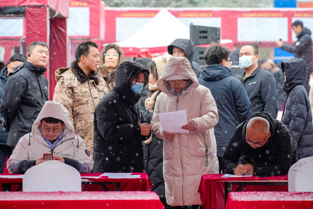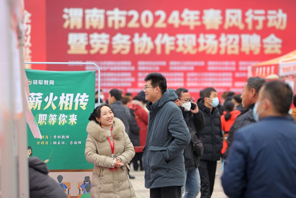 2月19日,求職者在陜西省渭南市2024年“春風(fēng)行動”暨勞務(wù)協(xié)作現(xiàn)場招聘會了解企業(yè)招聘情況。新華社發(fā)(崔正博攝)