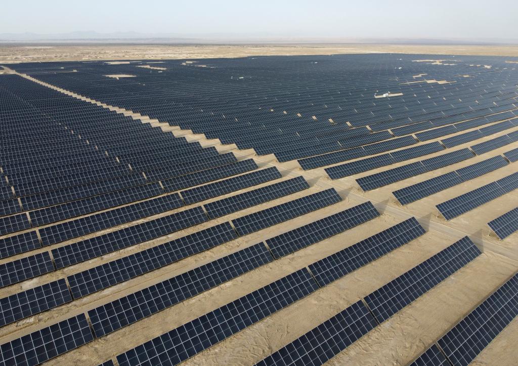 這是2023年9月拍攝的中國(guó)石油塔里木油田尉犁縣10萬(wàn)千瓦光伏發(fā)電項(xiàng)目(無(wú)人機(jī)照片)。新華社記者郝建偉 攝