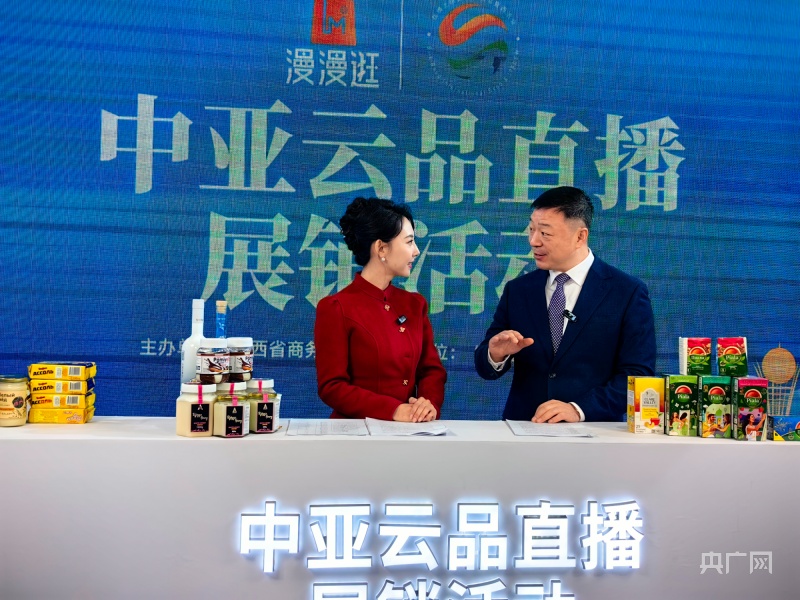 第七屆絲博會(huì)上,一場(chǎng)中亞云品展銷(xiāo)活動(dòng)直播正在進(jìn)行(央廣網(wǎng)記者 陳鏘 攝)