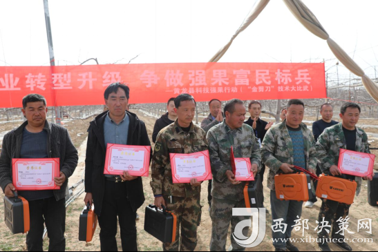 西部決策網(wǎng)訊 近日,黃龍縣果業(yè)中心、三岔鎮(zhèn)人民政府在三岔鎮(zhèn)木昌橋村聯(lián)合舉辦“金剪刀”技術大比武。本次比賽特邀請西北農(nóng)林科技大學園藝學院研究員,博士生導師,國家蘋果產(chǎn)業(yè)技術體系延安綜合試驗站站長鄒養(yǎng)軍,以及延安市和洛川縣等地的果業(yè)專家擔當評委。來自全縣4個涉果鄉(xiāng)鎮(zhèn)的優(yōu)秀果農(nóng)代表11人以及果業(yè)中心技術員3人參賽。
